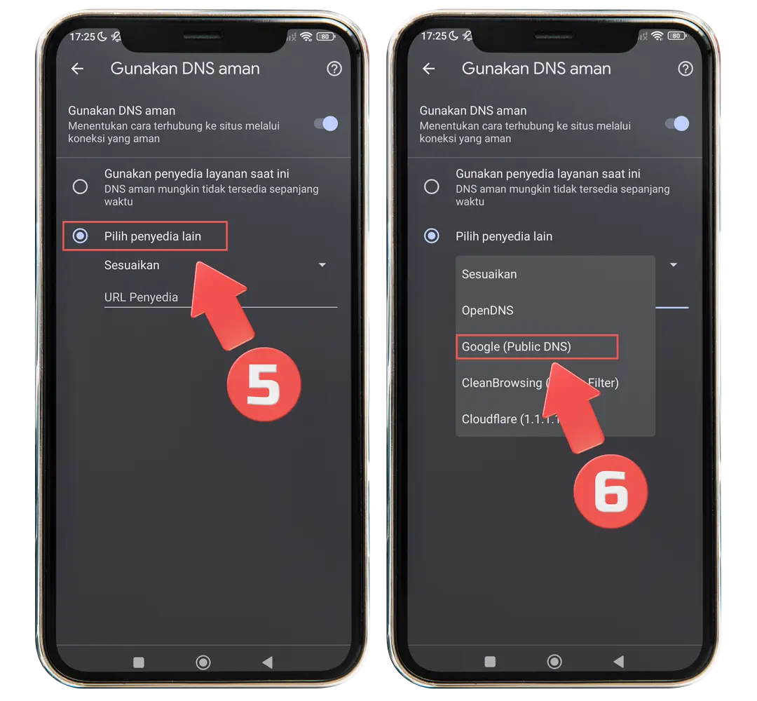KLik Sesuaikan dan pilih Google (public DNS) atau Cloudflare (1.1.1.1)